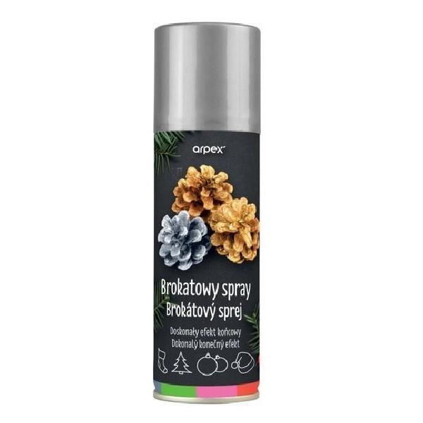 Brokat w sprayu w kolorze srebrnym, prosty w użyciu.