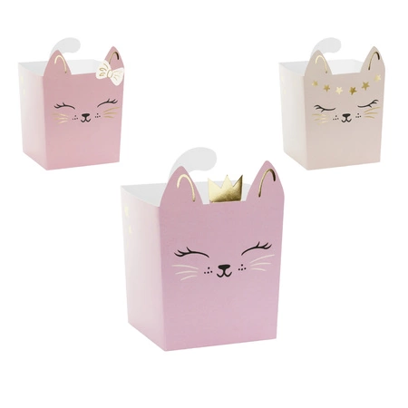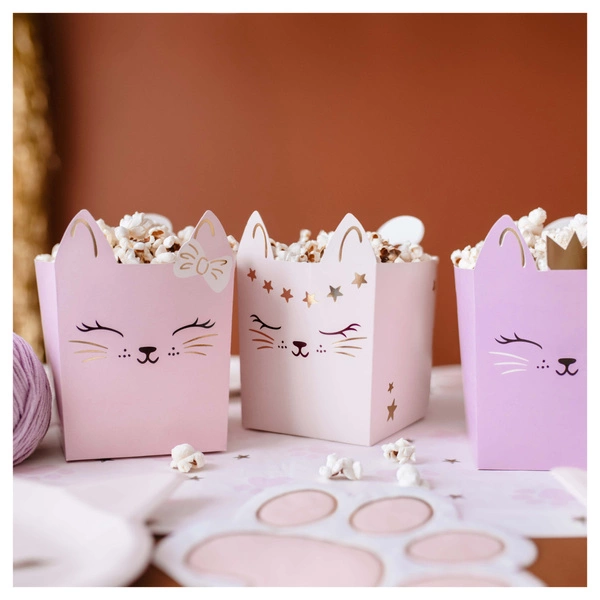 Wprowadź słodki nastrój pełen kociego uroku! Te papierowe pudełka z motywem kotków z pastelowym akcentem rozświetlą każde przyjęcie — dodając wyjątkowego wdzięku i nuty magii chwili.