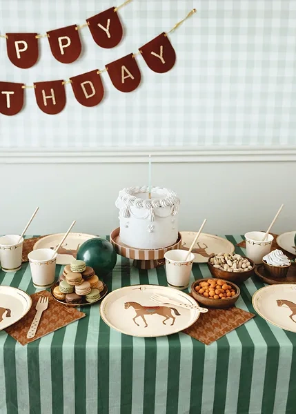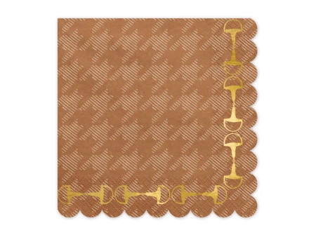 Brązowe, papierowe serwetki w pepitkę ze złotym, błyszczącym nadrukiem strzemion.