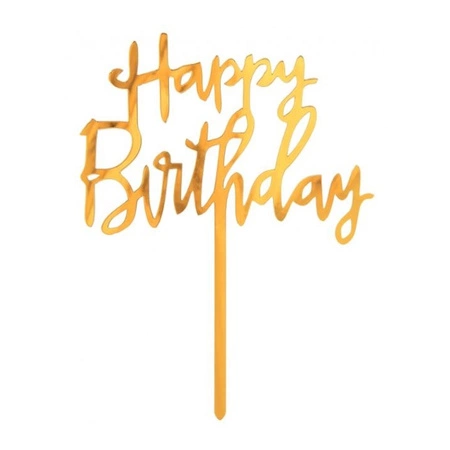Topper na tort z napisem Happy Birthday, akrylowy w kolorze złotym.