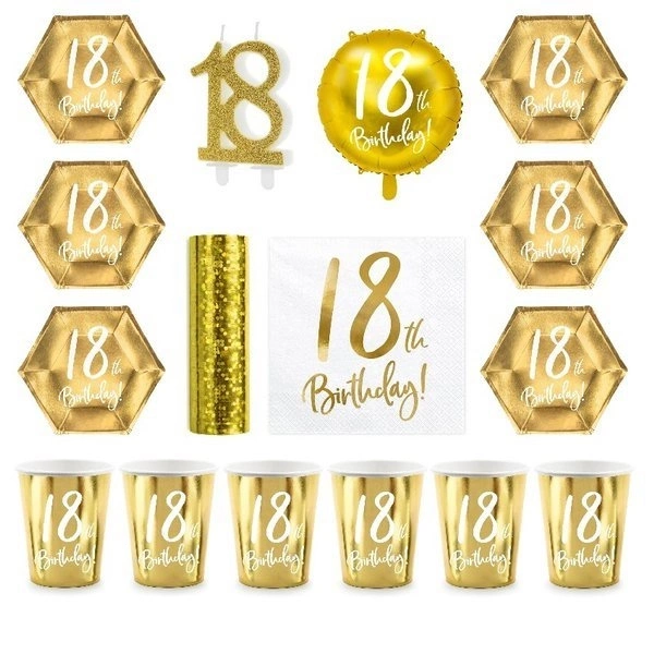 Zestaw urodzinowy na 18 urodziny kubeczki talerzyki serwetki złote 35el. zes-18-1