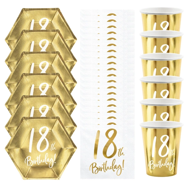 Zestaw urodzinowy kubeczki, talerzyki i serwetki na 18 urodziny papierowe złote zes-18-7