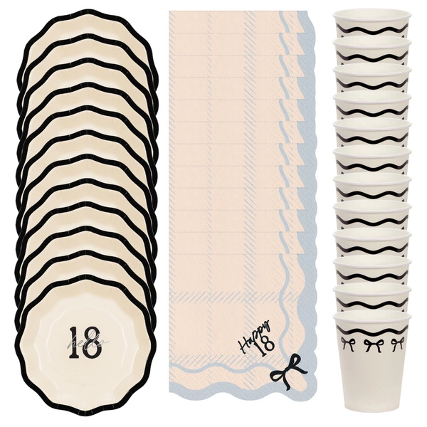 Kubeczki, talerzyki i serwetki na 18 urodziny papierowe kremowe czarne kokardki 12 osób zes-18-12