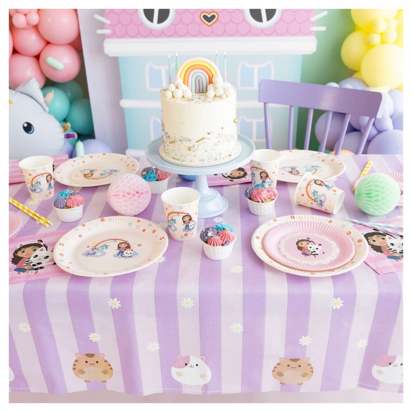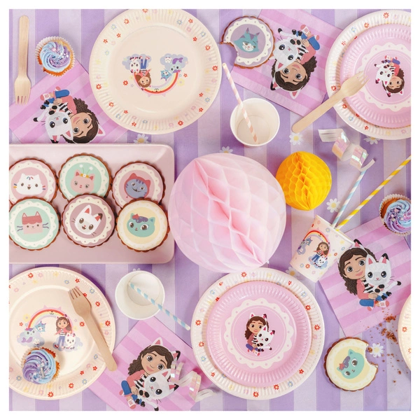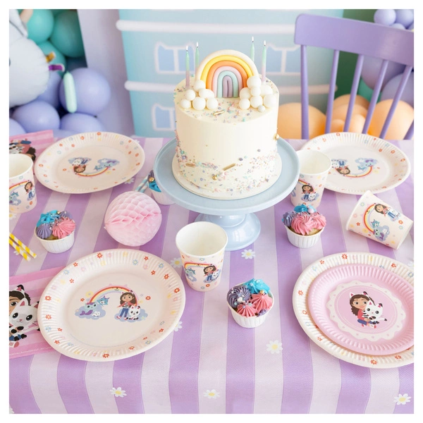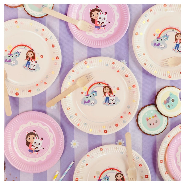 Na każdym talerzyku czeka Gabby wraz ze swoimi uroczo zakręconymi kotkami i kolorową tęczą. To idealne tło dla kawałka tortu, muffinek czy ulubionych przekąsek dzieci. Dzięki nim zwykły deser staje się częścią bajkowej historii.
