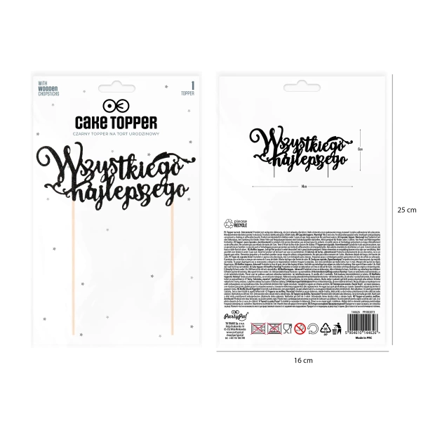 Topper na tort z napisem Wszystkiego najlepszego czarny brokatowy 19cm 1 sztuka 144626