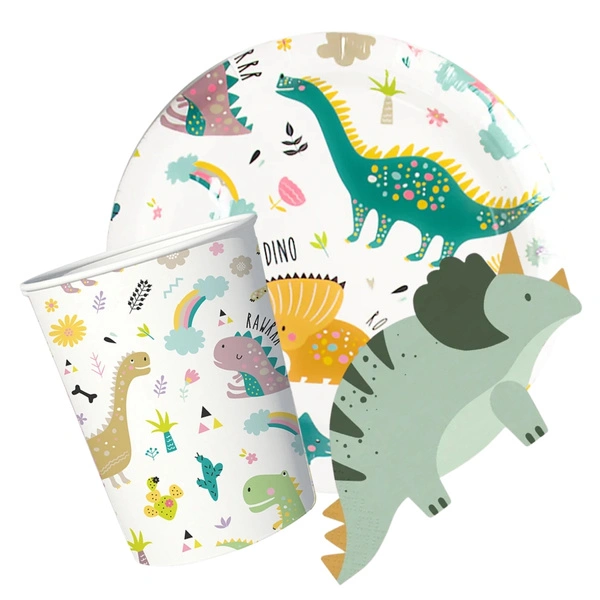 Kubeczki, talerzyki i serwetki papierowe z serii Dinozaury.