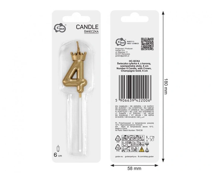 Świeczka na tort cyfra 4 z koroną szampańskie złoto 6 cm 1 sztuka HC-SCK4
