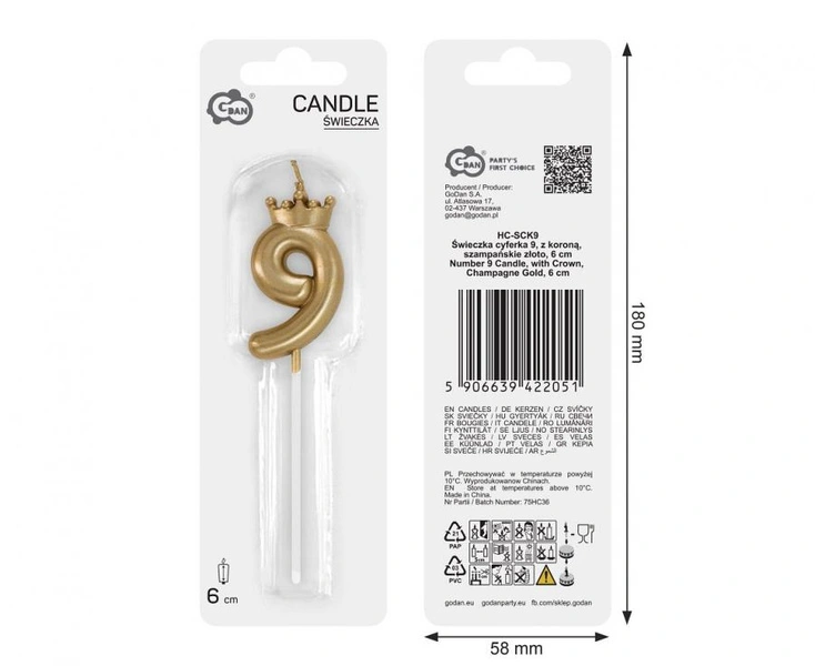 Świeczka na tort cyfra 9 z koroną szampańskie złoto 6 cm 1 sztuka HC-SCK9