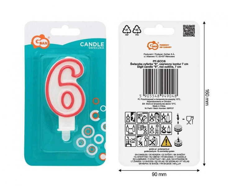 Świeczka na tort cyfra 6 czerwony kontur 8 cm 1 sztuka PF-SCC/6