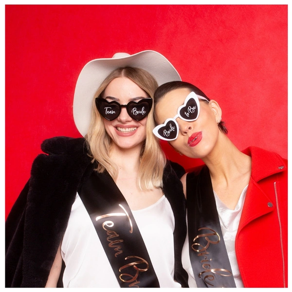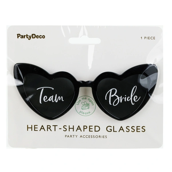 Okulary serduszka z napisem "Team Bride" w kolorze czarnym z czarnymi soczewkami.