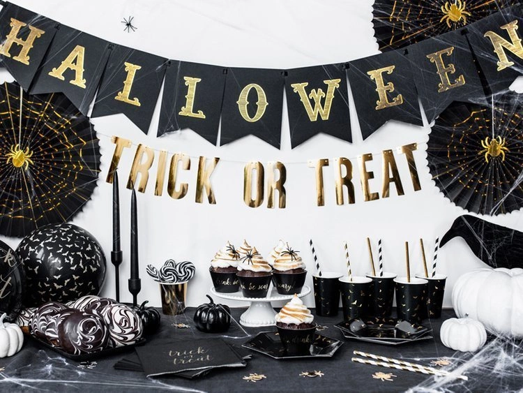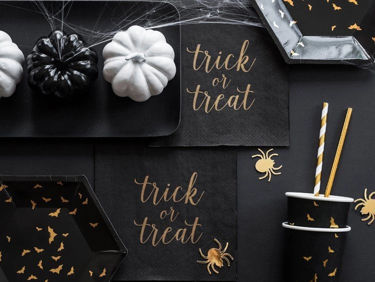 Kubeczki papierowe Trick or Treat w kolorze czarnym ze złotym wzorem.