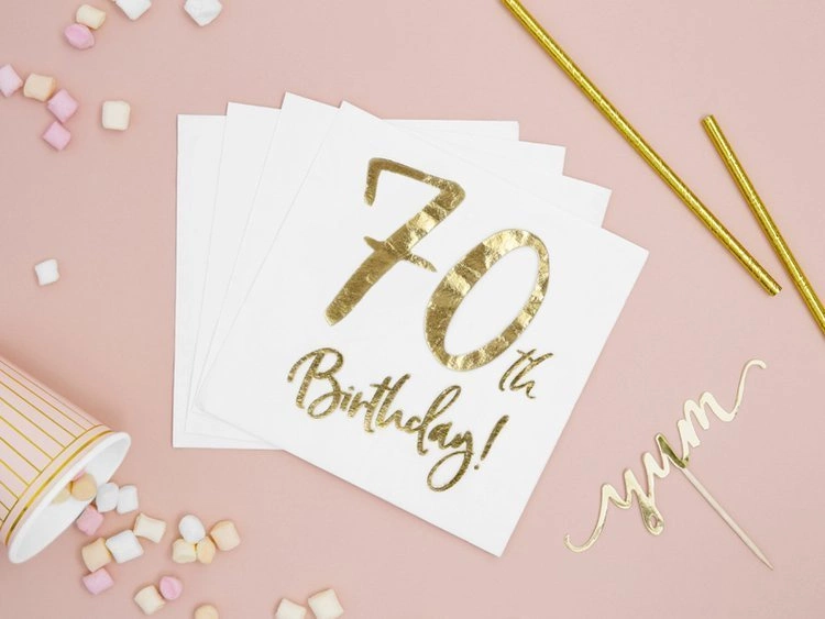 Serwetki papierowe  na stół 70th Birthday w kolorze białym ze złotym wzorem.