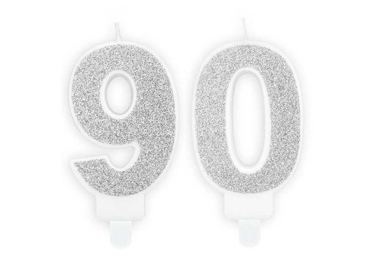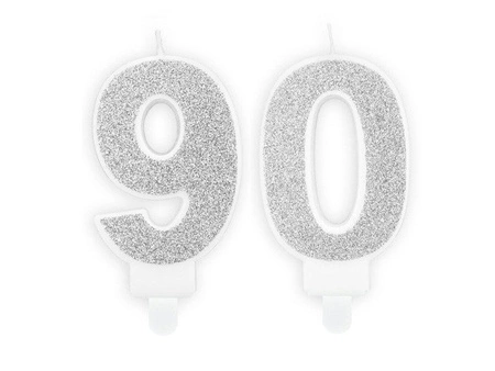 Świeczki na tort 90 urodziny srebrne brokat 7cm SCU3-90-018B