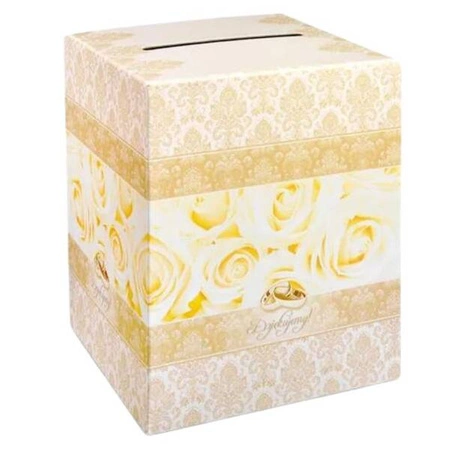 Na pudełku widnieje złoty ornament, kremowe róże, złote obrączki oraz napis Dziękujemy!